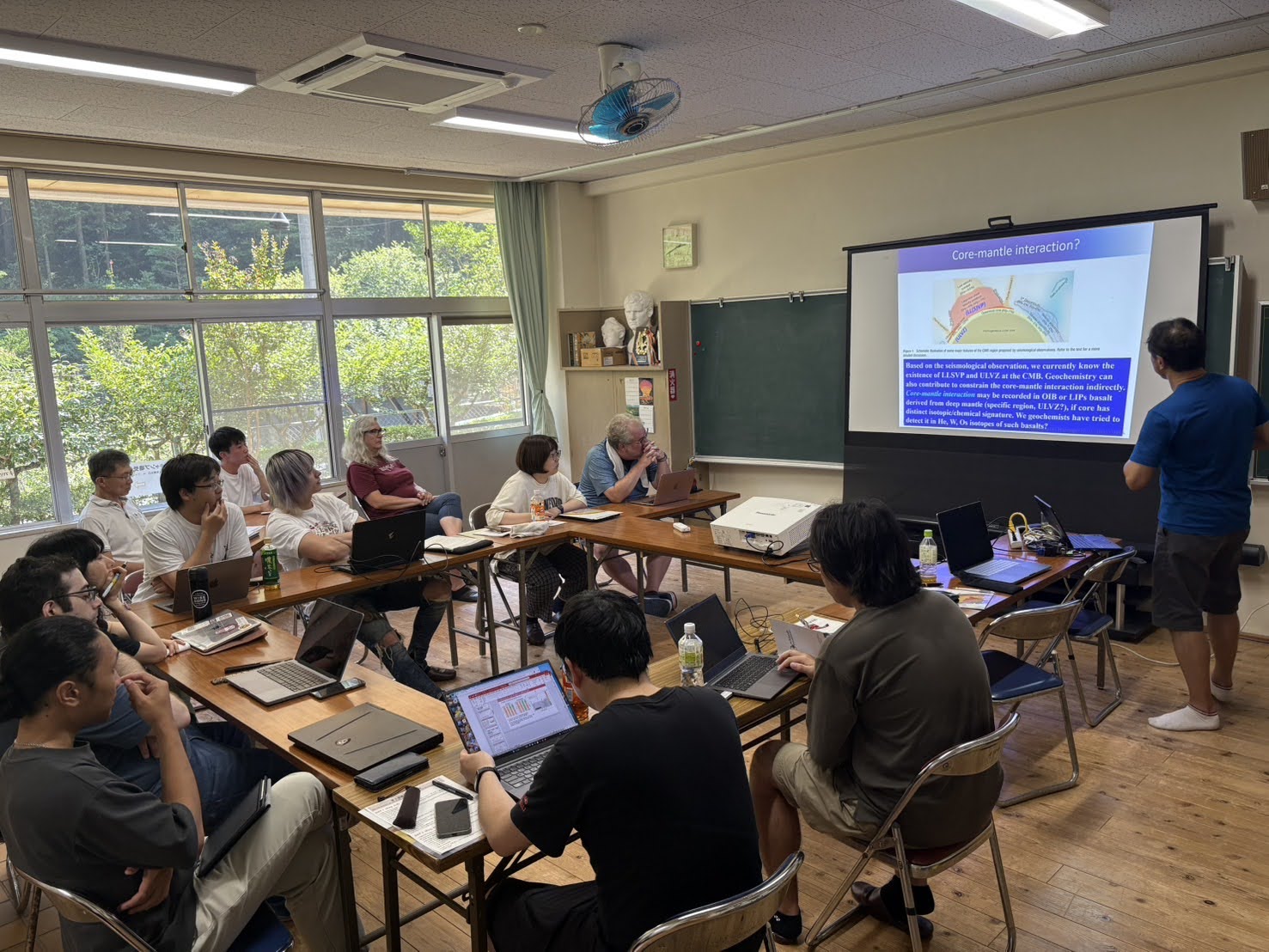 GRC数値系地球科学部門のメンバーが中心となり、2025年8月3日~6日に、第9回惑星深部研究会をしもなの郷(高知県仁淀川町)で開催いたしました。今回は愛媛大学と東京大学、東京科学大学、ポアティエ大学、JAMSTECの研究者・学生ら計18名(うち外国人7名)が参加し、高知県仁淀川町のしもなの郷、四国カルスト天狗高原のカルストテラスにて、三泊四日の研究集会を行いました。