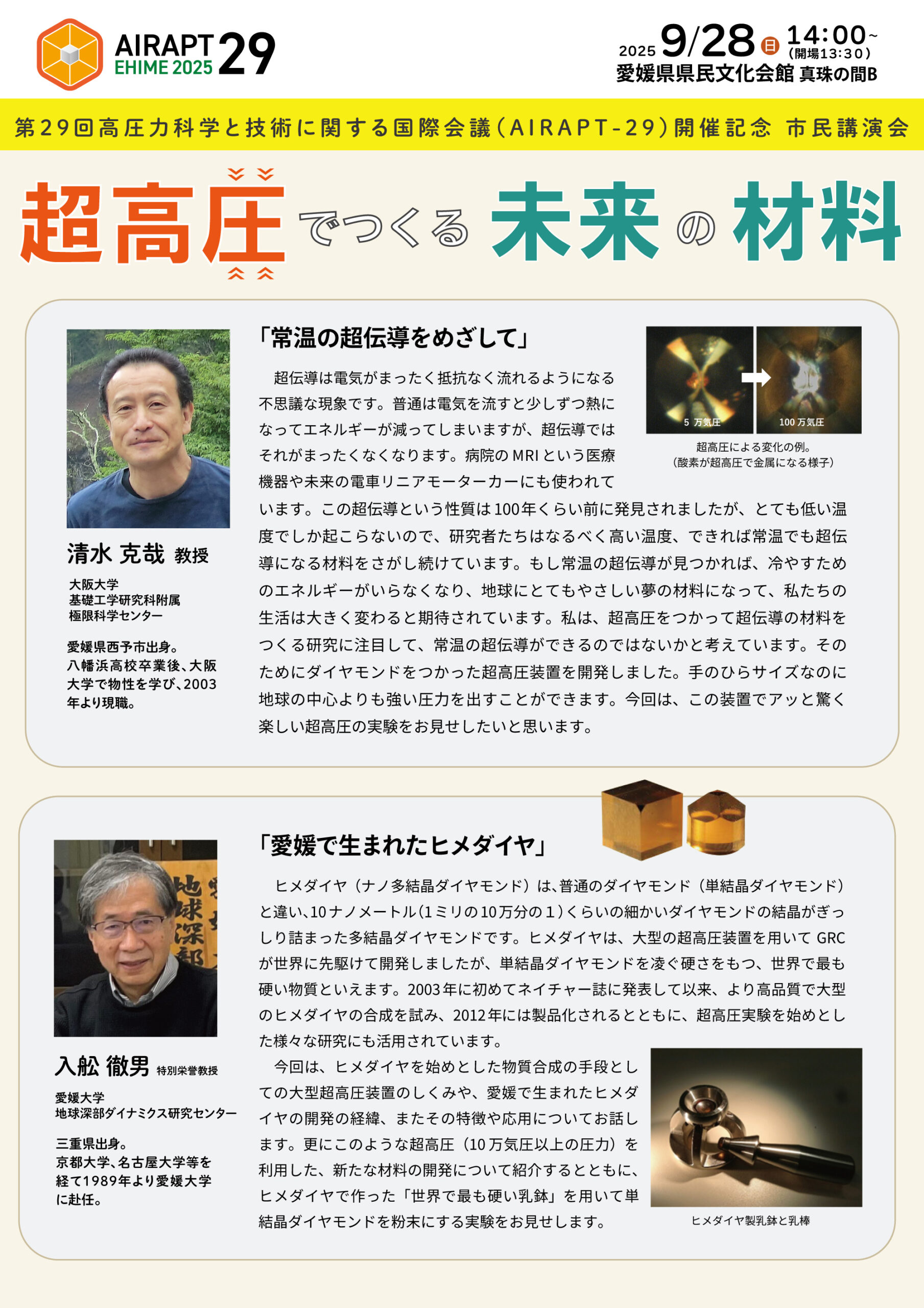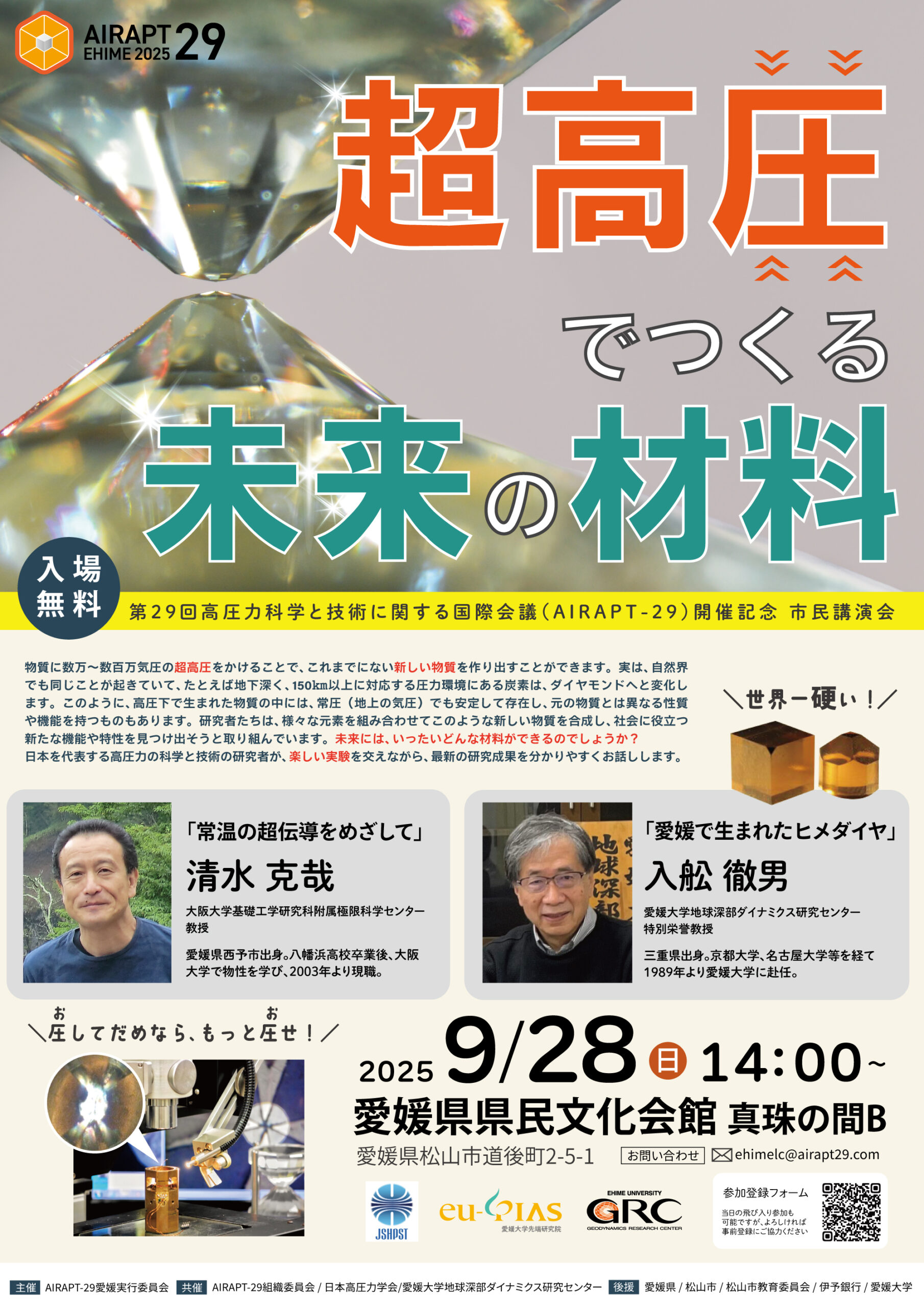 2025年9月28日より愛媛県民文化会館にて行われる AIRAPT-29(第29回高圧力科学と技術に関する国際会議)に先駆けて、AIRAPT-29愛媛実行委員会が主催、日本高圧力学会とGRCが共催となり、市民講演会「超高圧でつくる未来の材料」を以下のとおり開催いたします。