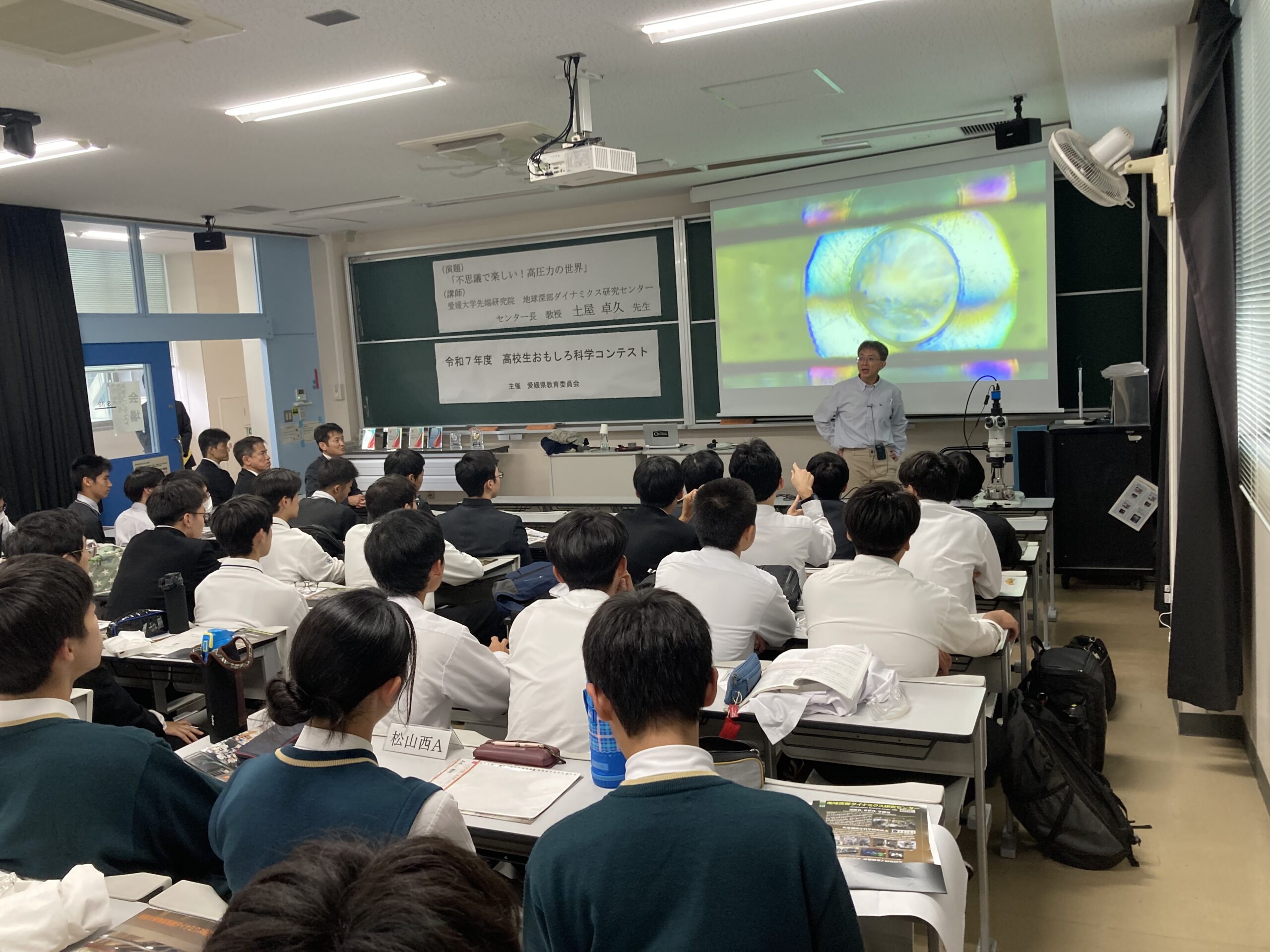 2025年11月9日(日)、愛媛県教育委員会主催による「高校生おもしろ科学コンテスト」本選が愛媛大学で開催されました。競技の後には、GRCの土屋卓久センター長が「不思議で楽しい!高圧力の世界」と題した講演を行いました。