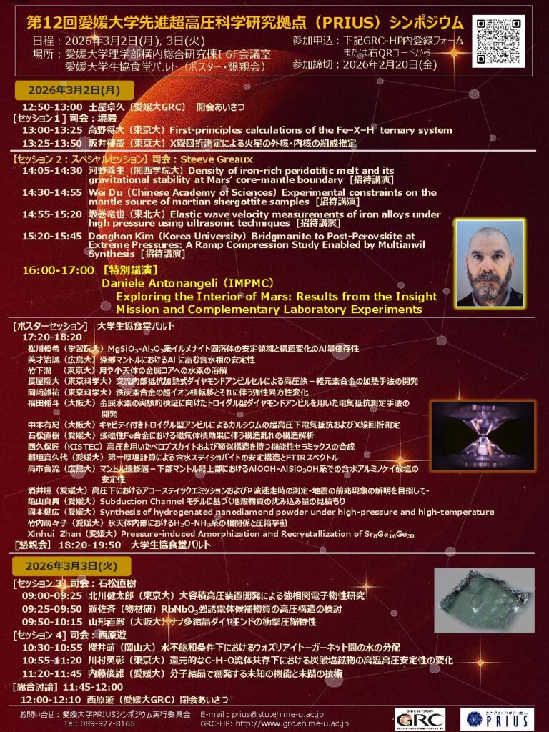 2026年3月2日(月)~3月3日(火)に本拠点の共同利用・共同研究の成果報告会を兼ねた「第12回PRIUSシンポジウム」を開催いたします。今まで本拠点での共同利用・共同研究の実績がない方々のご参加も歓迎いたしますので、これを機に今後の本拠点での共同利用・共同研究を基にした超高圧科学研究の推進にご協力いただければ幸いです。また、今回は通常の成果報告に加えて「Planetary interior exploration(惑星深部研究)」をテーマとしたセッションと以下の特別講演を企画しておりますので、ぜひご参加ください。幅広い研究分野からのご講演の申込を歓迎いたします。